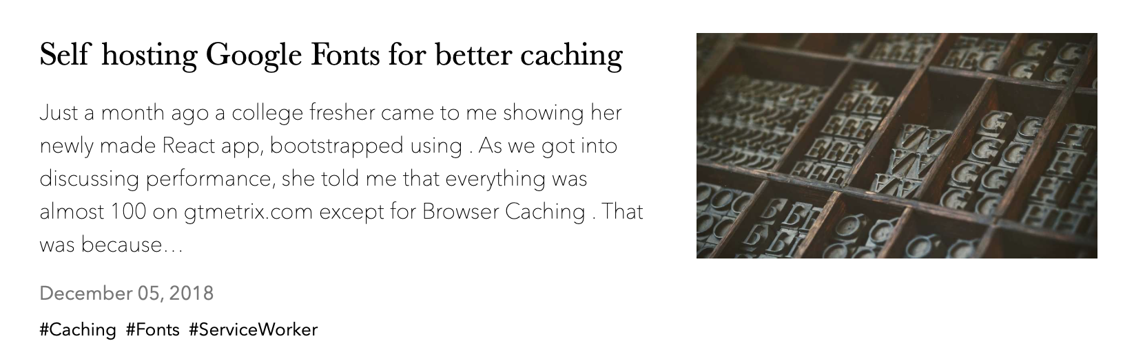 gatsby-image is a very powerful package with drool-worthy features. It makes it very easy to implement, Medium like progressive image loading. It can do a bunch of other stuff but that’s the fancy stuff that we won’t be going into. But I decided to not use it for this website, mostly because it doesn’t play well with Netlify CMS. And, I was quite happy with the site’s performance as it didn’t have many images.